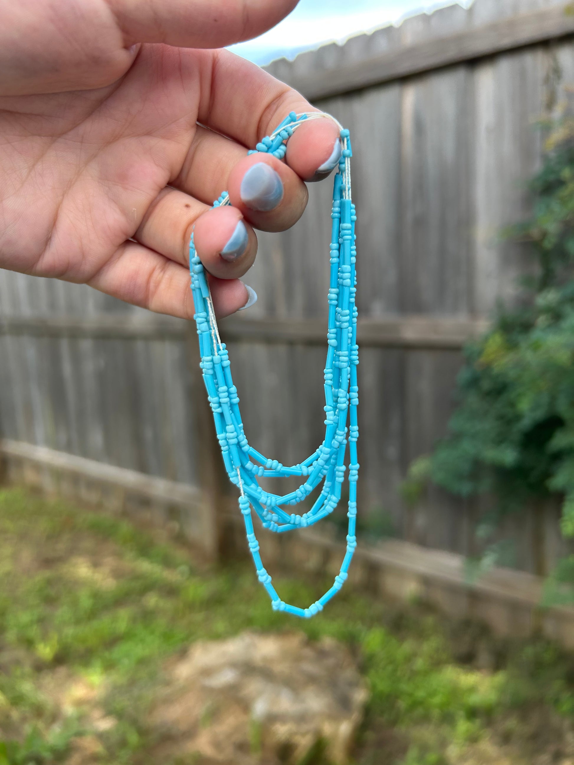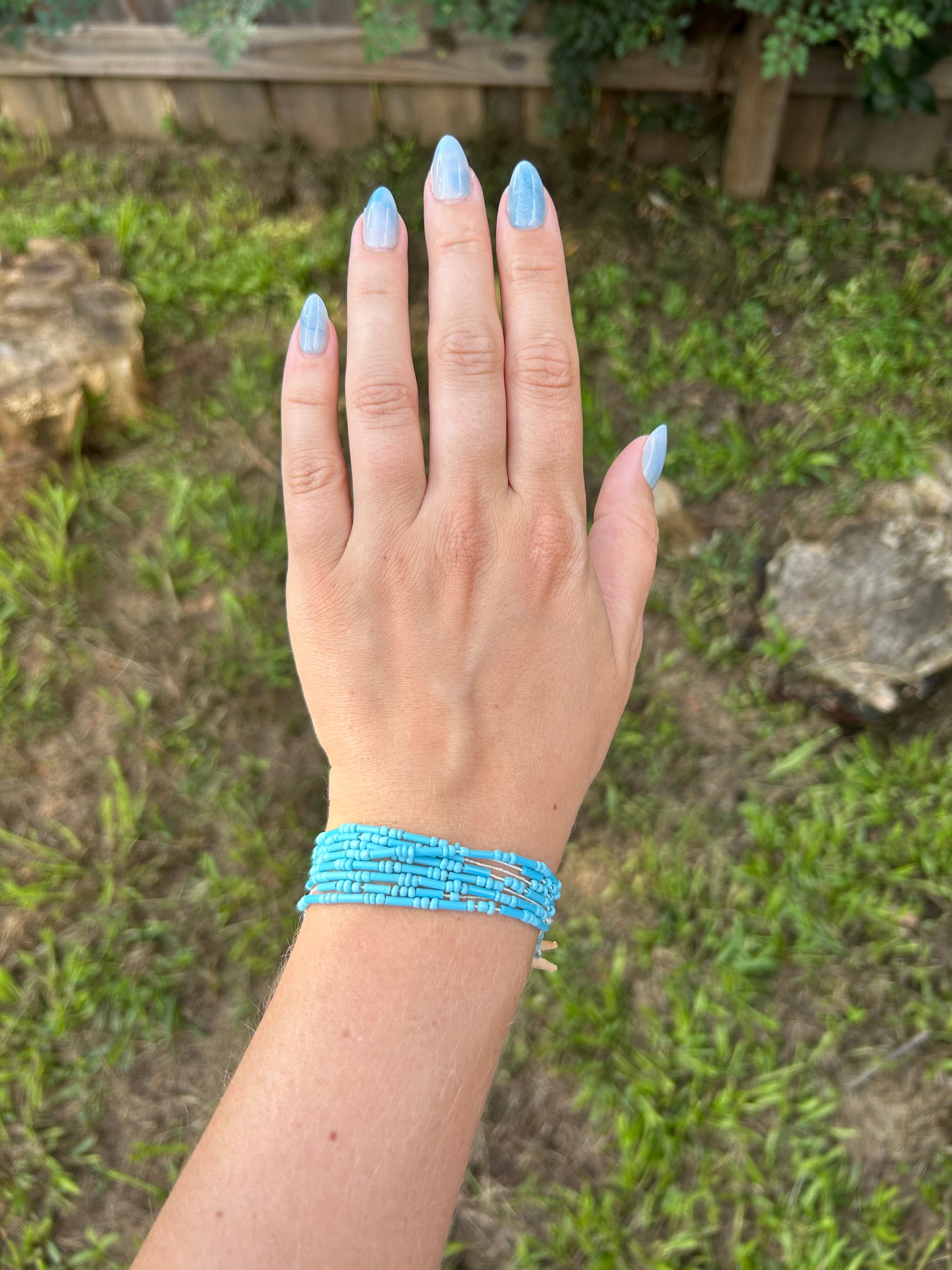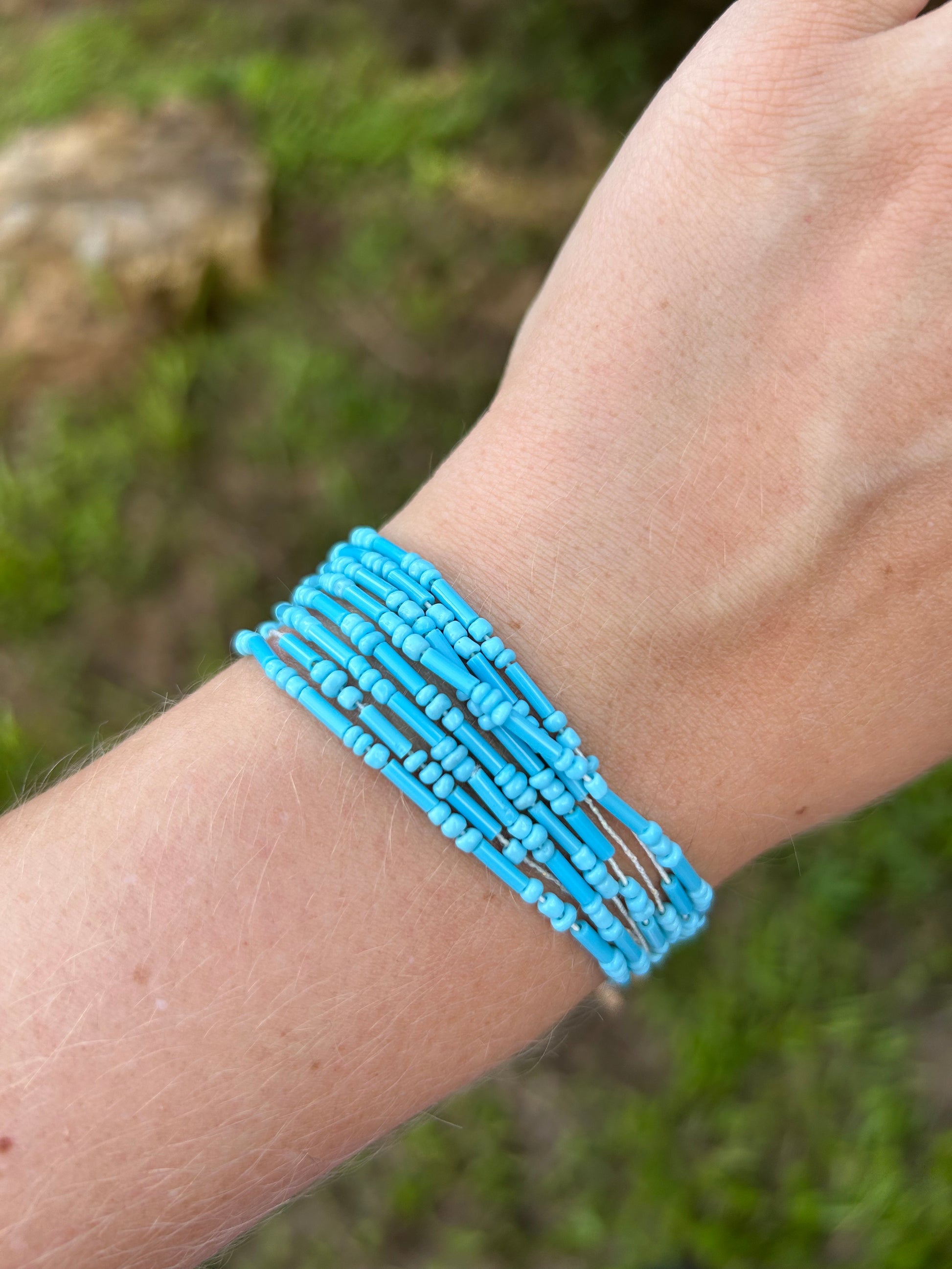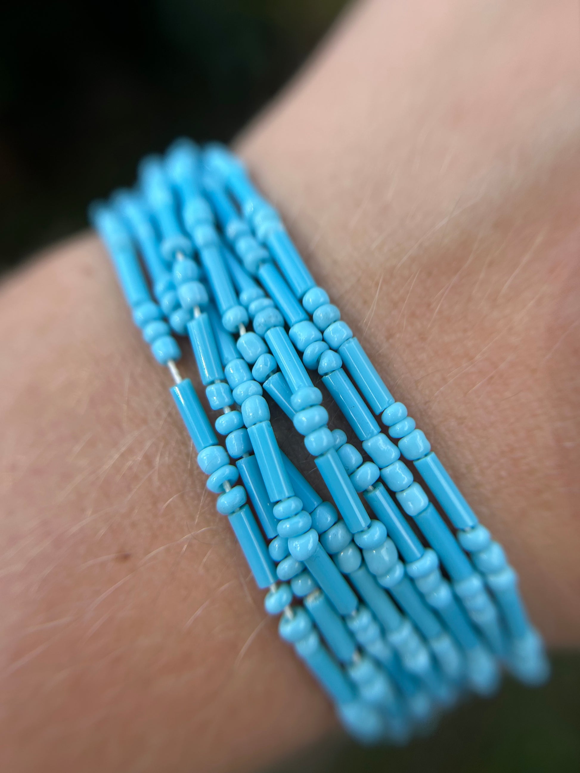 The Waterfalls Bracelet features eight strands of vibrant turquoise beads on an elastic band, offering a colorful and flexible accessory, though some strands may show slight stretching.
