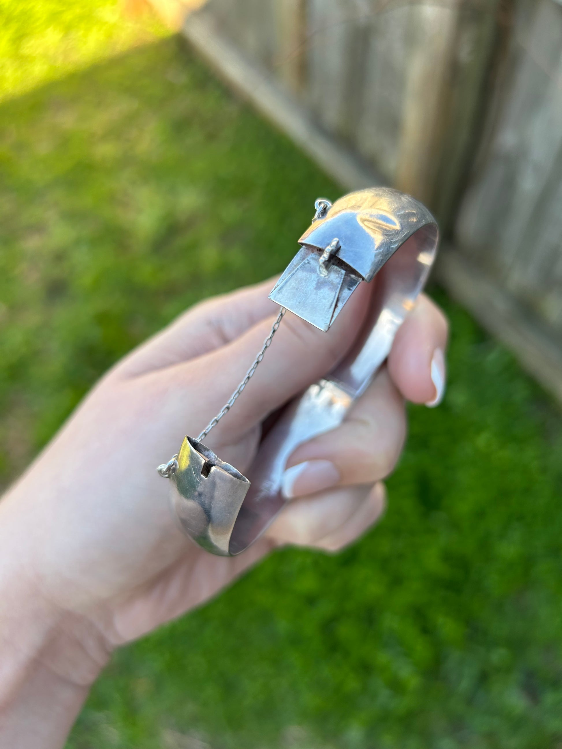 Upgrade your accessory game with the Corridor Bracelet. This simple bangle is crafted from sterling silver for a sleek and sophisticated look. The convenient button clasp adds a touch of elegance while making it easy to put on and take off. Elevate any outfit with this must-have piece.