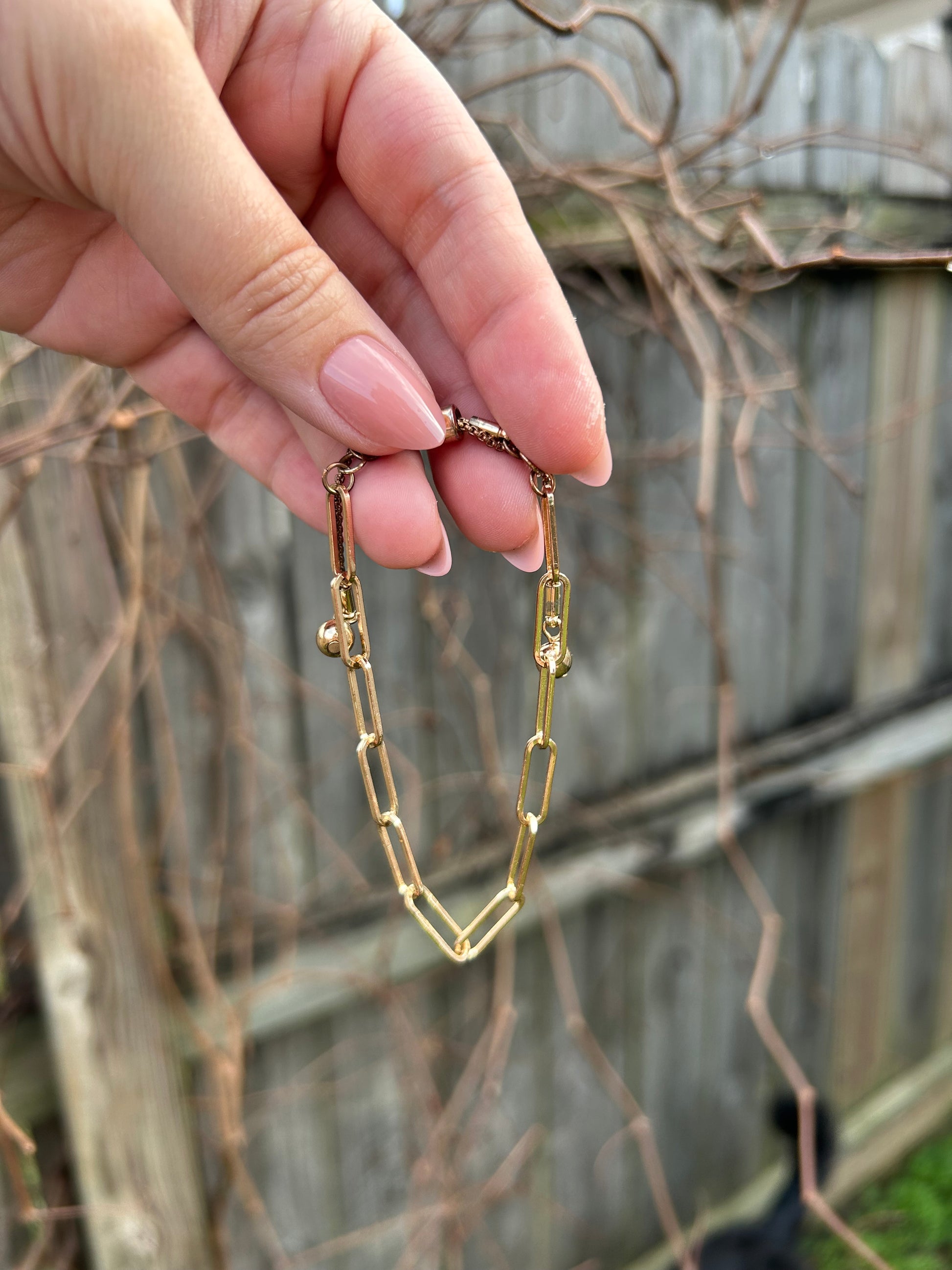 Discover the modern appeal of this gold-toned bracelet, crafted with a distinctive paperclip chain design that makes a contemporary statement. The adjustable fit ensures a personalized wear experience, allowing you to find your perfect comfort level. Versatile enough to layer or wear solo, this piece brings effortless sophistication to your everyday style.
