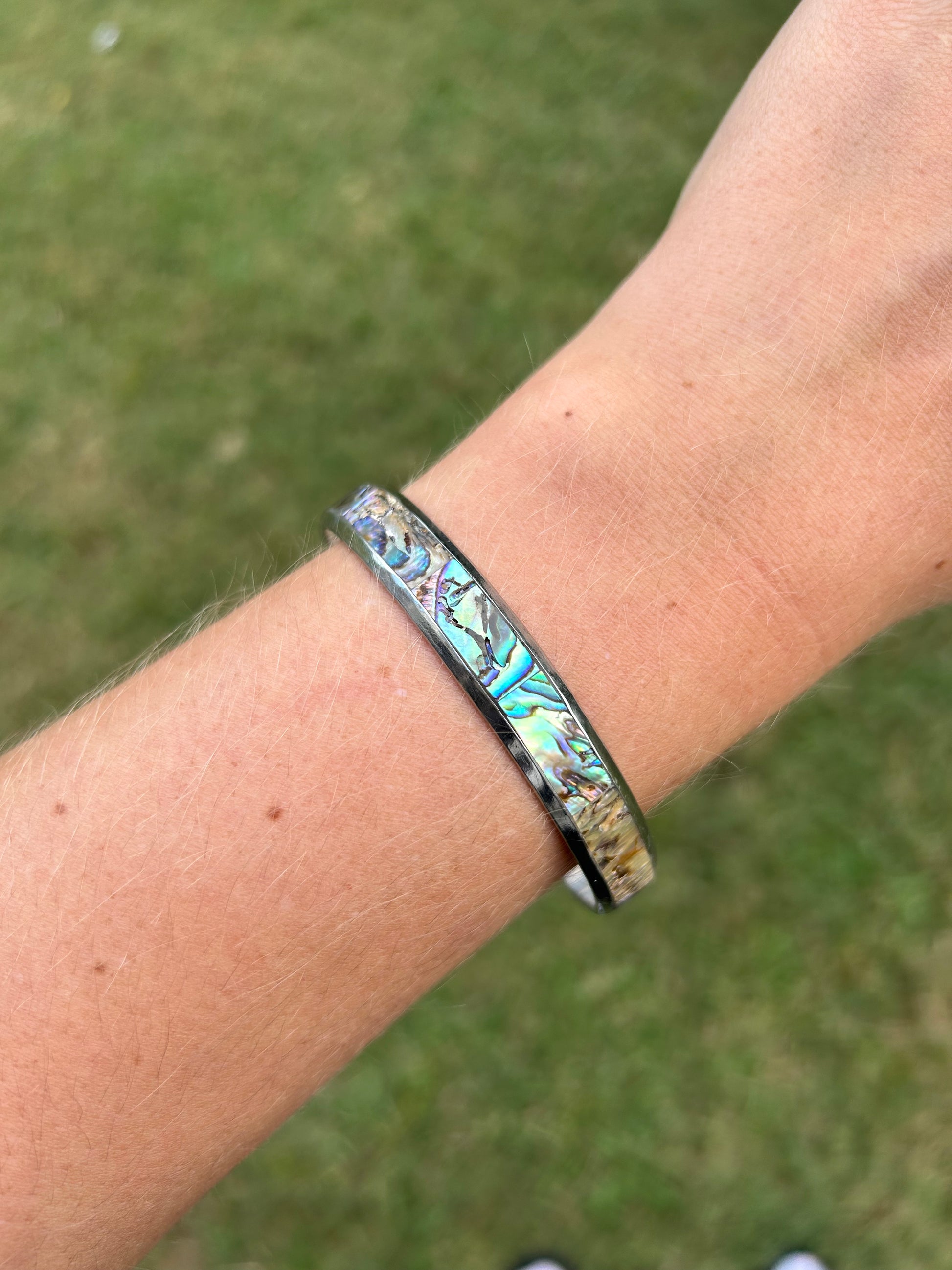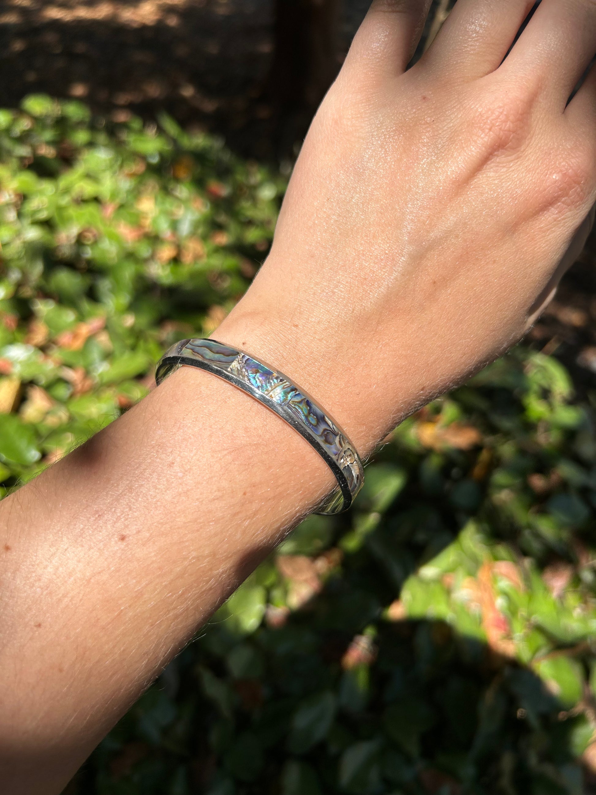 Elevate your style with the Selene Bracelet Cuff! Made with sterling silver and adorned with shimmering abalone shell, this cuff is the perfect blend of chic and iridescent. Add a touch of elegance to any outfit and embody confidence and beauty.