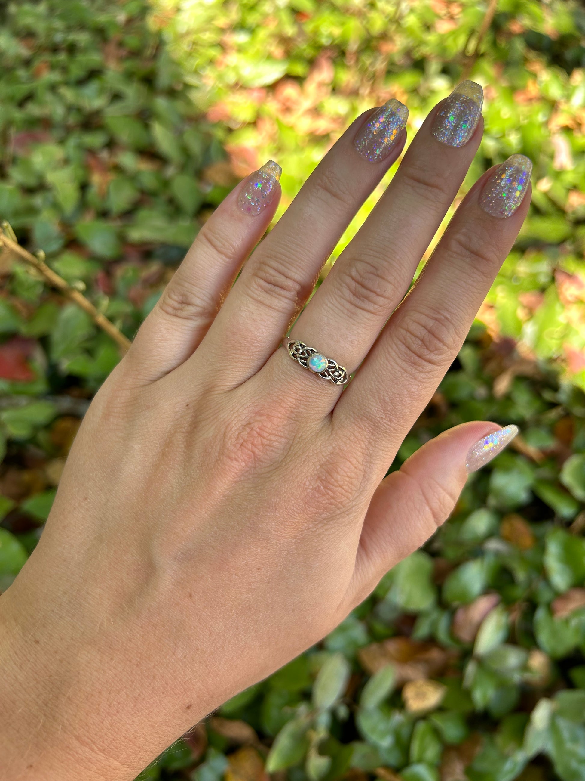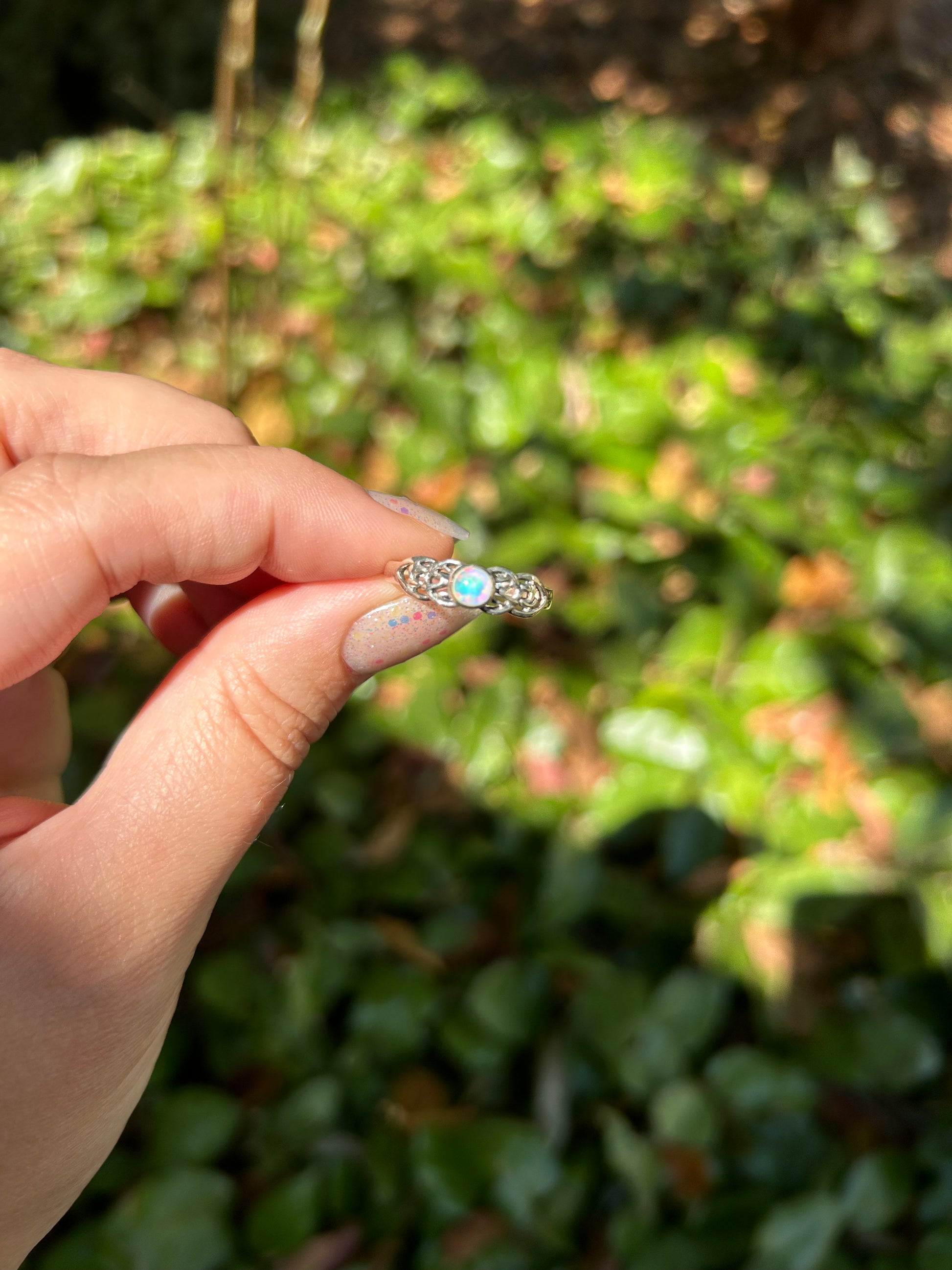 Experience pure elegance and ethereal beauty with our Elysia Ring. Handcrafted with sterling silver and a stunning opal, this dainty ring exudes a delicate charm. Adorn your finger with this piece to add a touch of whimsy and mystique to your everyday look.