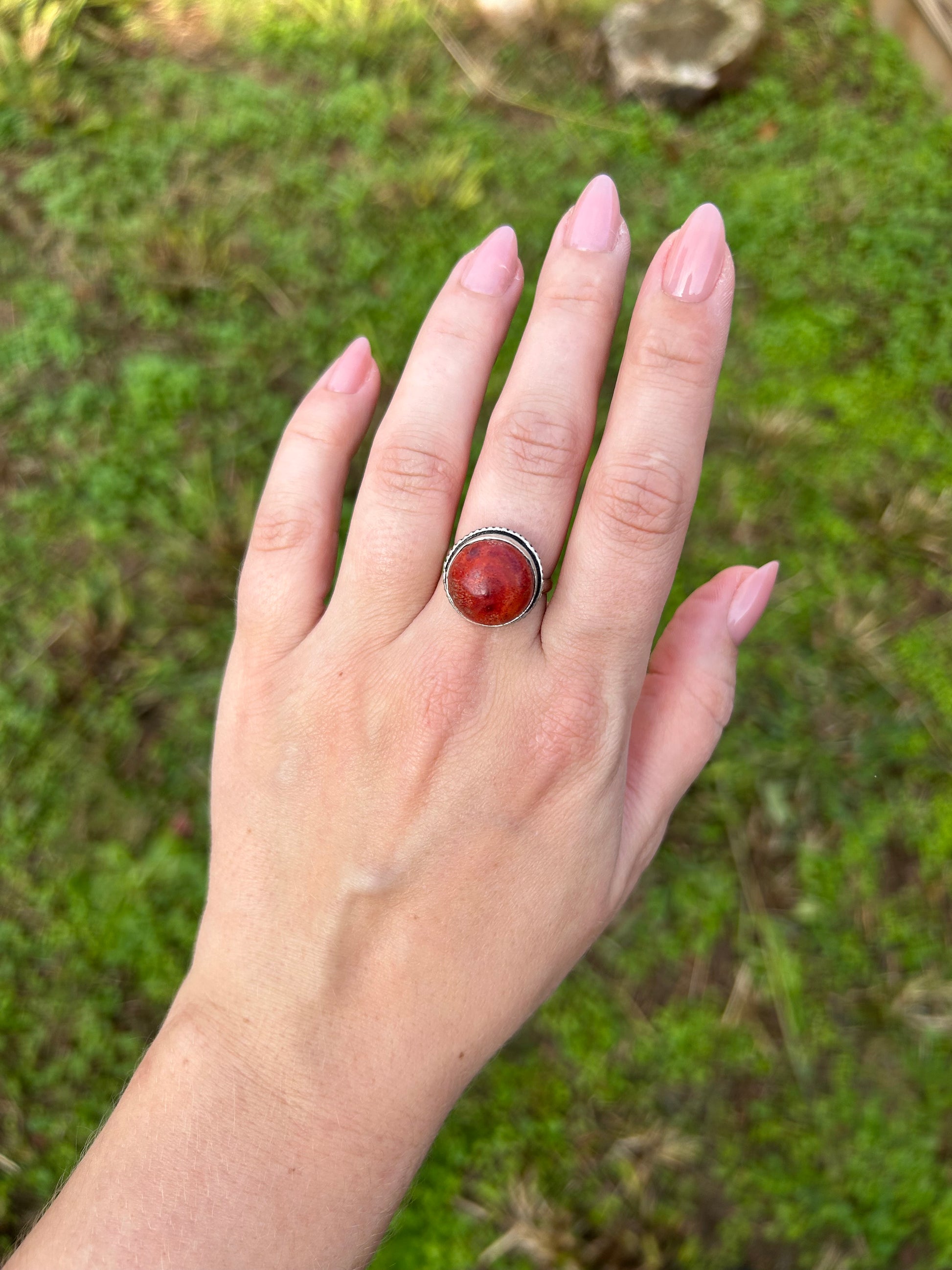 Discover the perfect blend of natural beauty and timeless elegance with this stunning coral ring. Crafted from lustrous sterling silver, it features a vibrant coral stone set in a graceful circular dome design that catches the light beautifully. The bohemian aesthetic makes it an ideal choice for those seeking distinctive, artisan-inspired jewelry that stands out from the ordinary. Whether you're dressing up for a special occasion or adding character to your everyday style, this piece brings warmth and sophistication to any look.
